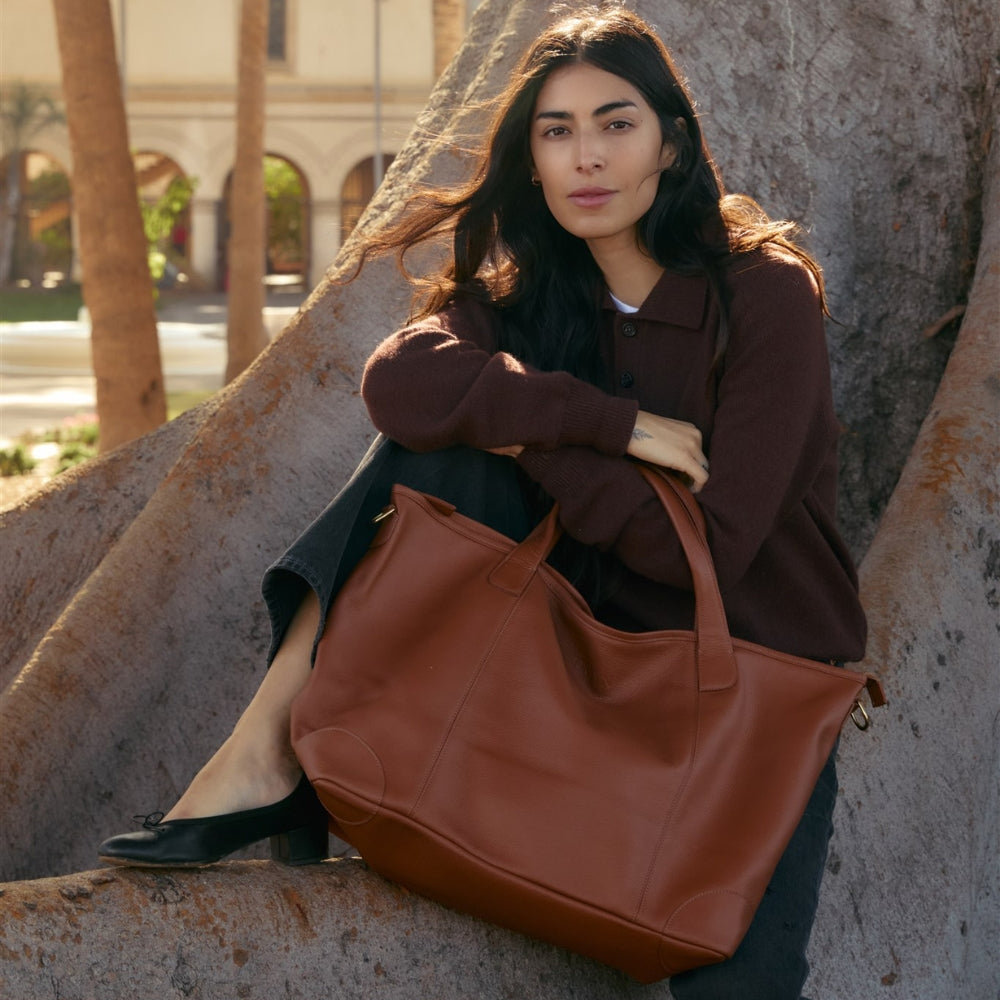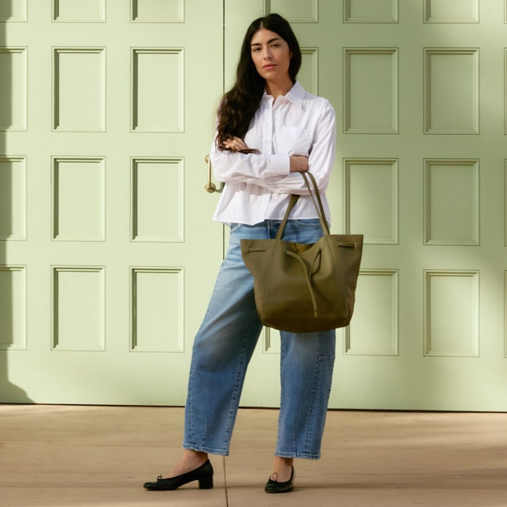 This versatile tote shifts shape with a clasped or open silhouette. A hidden magnetic closure and interior slip pockets add function and quiet security.